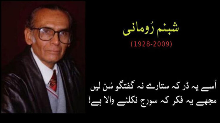 Shabnam Romani was a prominent poet and writer of literary circles of Karachi. His collections, ‘Musnavi Sair Karachi’, ‘Jazeera’, ‘Harf-e Nisbet’, ‘Tohmat’ and ‘Dosra Himala’ became popular.