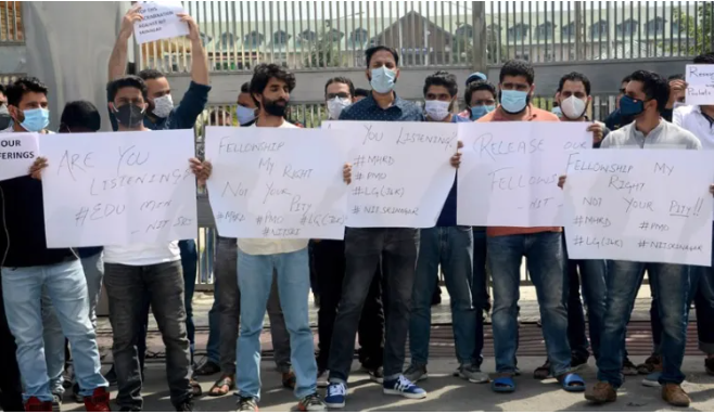 In Indian illegally occupied Jammu and Kashmir, as a mark of growing frustration among employees and the general public, PhD scholars staged a protest in Srinagar against the delay in