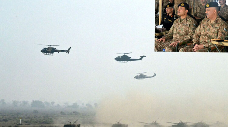The Army Chief witnessed integrated fire and battle maneuvers of various elements, including Armour, Mechanized Infantry, Artillery, Air Defense, Anti-Tank Guided Missiles (ATGMs) duly supported by Pakistan Air Force (PAF) and Combat Aviation.