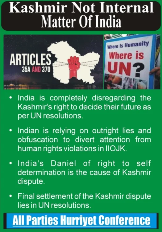 According to Kashmir Media Service, the APHC spokesman in a statement in Srinagar said India is completely disregarding the Kashmiris’ right to decide their future as per the UN resolutions and is relying on outright lies to divert attention from the human rights violations by its troops in occupied Kashmir.