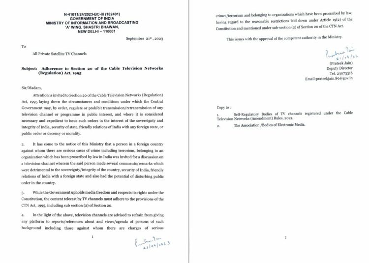 This comes after it came to the notice of the Ministry that a person in a foreign country against whom there are serious cases of crime including terrorism, belonging to an organization which has been proscribed by law in India was invited for a discussion on a television channel wherein the said person made several comments/remarks which were detrimental to the sovereignty/integrity of the country, security of India, friendly relations of India with a foreign state and also had the potential of disturbing public order in the country.