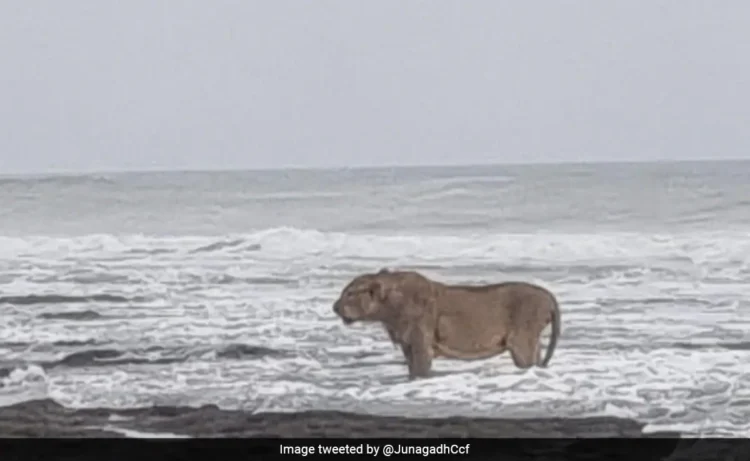 India: A stunning and rare image of an Asiatic lion standing on the shores of the Arabian Sea in Gujarat’s Junagadh has left the internet in awe. In the undated picture that has gone viral, the lion can be seen casually standing on the banks of the Arabian Sea, as if it were enjoying the waves of the sea.