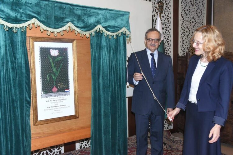 Foreign Secretary, Muhammad Syrus Sajjad Qazi and Ambassador of the Netherlands to Pakistan, Henry de Vries, today launched a special commemorative postage stamp to mark the 75th anniversary of the establishment of diplomatic relations between Pakistan and the Netherlands.