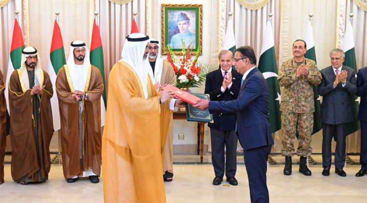 Prime Minister Shehbaz Sharif and Crown Prince of Abu Dhabi Sheikh Khaled bin Mohamed bin Zayed Al Nahyan both witnessed the ceremony.