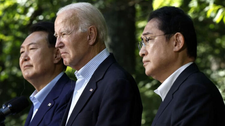 During a summit at the Camp David, US President Joe Biden Japanese Prime Minister Fumio Kishida, and South Korean President Yoon Suk Yeol committed to consult promptly with each other during crises and to coordinate responses to regional challenges, provocations and threats affecting common interests.
